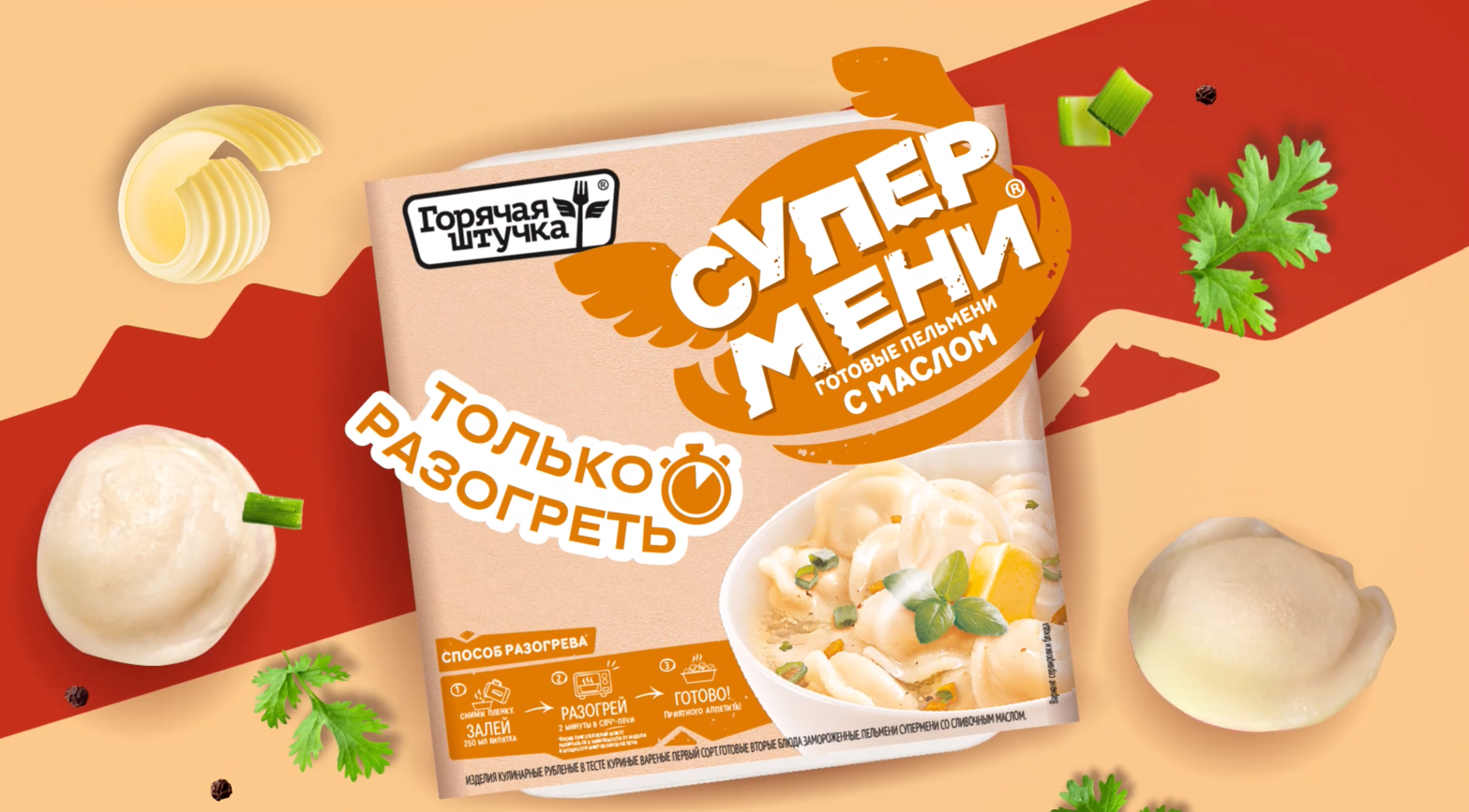 «Супермени» от Горячей штучки приготовлены по уникальной технологии: они сварены на пару и бережно заморожены. Благодаря технологии производства пельмени остаются сочными и имеют насыщенный мясной вкус